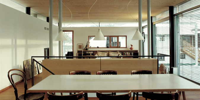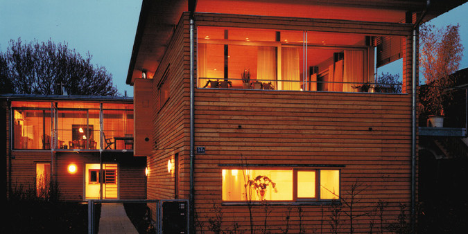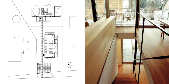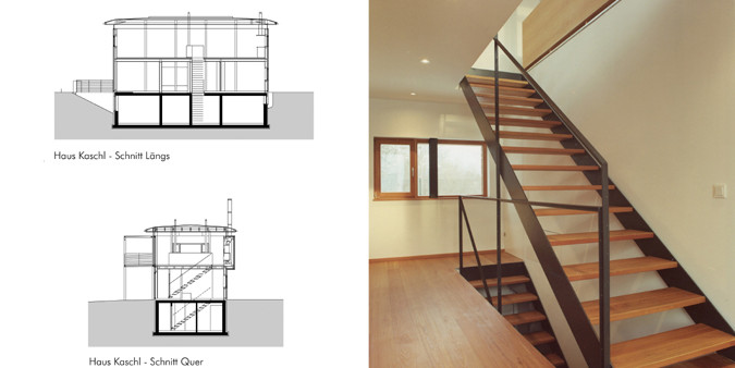 Auf kleinen Bauparzellen von je 380 m² im ehemals dörflich strukturierten Stadtteil Morzg wurden zwei zweigeschoßige Wohnhäuser in Holzriegelbauweise errichtet. Dabei trägt ein Gerüst von Stahlsäulen das schwebende Dach. Großzügige Wohnbereiche befinden sich in den Obergeschoßen, um eine optimale Besonnung und Belichtung sowie Aus- und Fernblicke zu ermög-lichen. Schlafräume und Nebenräume sind in der stärker beschatteten und kühleren EG-Zone angeordnet. Schiebeelemente öffnen die Innen-bereiche zu vorgelagerten Terrassen, Balkonen und Loggien. Für dieses Projekt wurden der Salzburger Holzbaupreis 2001 sowie der 3. Preis "Bauen auf kleinem Grund 2001" verliehen.
