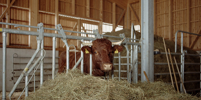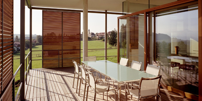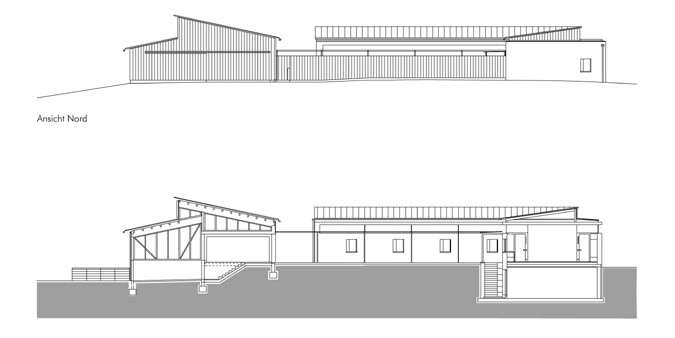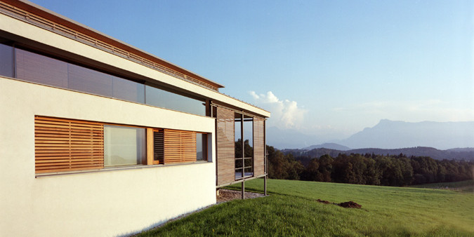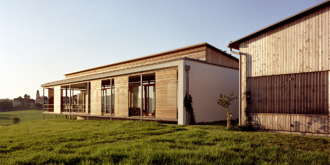 Auf einem 2 ha großen Grundstück in südlicher Hanglage wurde ein landwirtschaftliches Anwesen errichtet, in welchem Wohnhaus, Nebengebäude und Stall in logischer Ordnung zueinander stehen und sich um einen quadratischen Innenhof gruppieren. Alle Bauten verfügen über nach innen geneigte Pultdächer. Die Decke über dem EG ruht wie eine Tischplatte auf innen liegenden Pfeilern und ermöglicht so eine großzügige Verglasung nach außen samt umlaufendem Glasoberlichtband. Diverse Zitate und Elemente aus der traditionellen Bauernhausarchitektur wurden zeitgeistig umge-setzt.[nbsp]So verbindet die von Wilhelm Scherübl im Wohnbereich zeitgemäß interpretierte Schablonen malerei Herkömmliches mit Modernem.