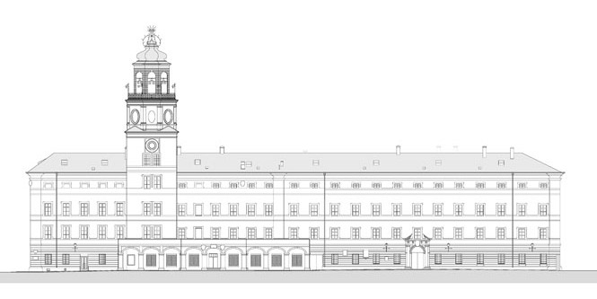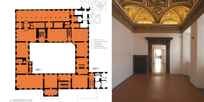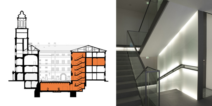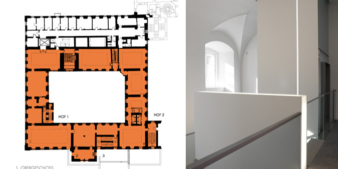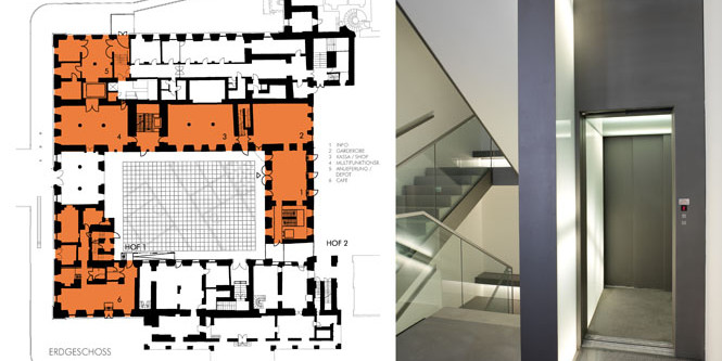 Das Siegerprojekt des EU-weiten Wettbewerbes basiert auf dem Entwurfsgedanken, ein denkmal-geschütztes Gebäude, welches als Museum Kunst und Kultur der Vergangenheit dokumentiert, einerseits in den Bereichen Eingangsportal, Stiegen, Café, Shop und Garderobe zeitgemäß zu gestalten, andererseits aber mit der historischen Substanz verantwortungsvoll umzugehen. Ursprüngliche, originale Raumfolgen und Raum-strukturen wurden herausgearbeitet, zum Teil behutsam rekonstruiert und adaptiert. Der zentrale Innenhof dient dabei als Orientierungshilfe - u.a. wurde das Hauptstiegenhaus so angeordnet, dass Bewegung und Sicht zum Hof orientiert sind.