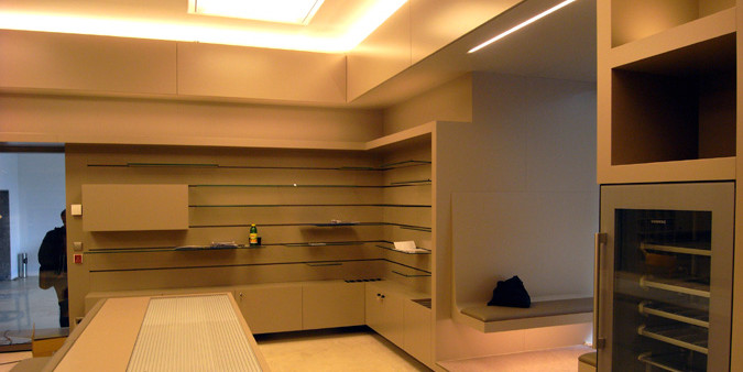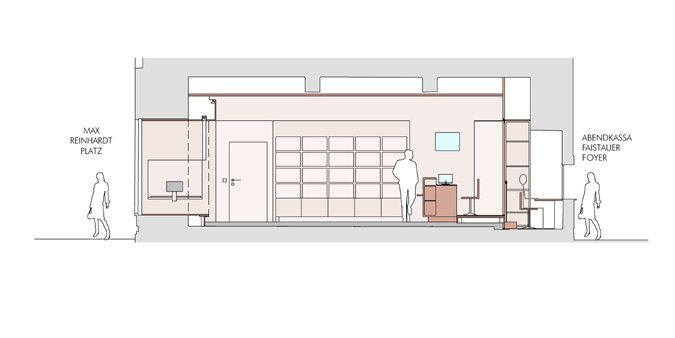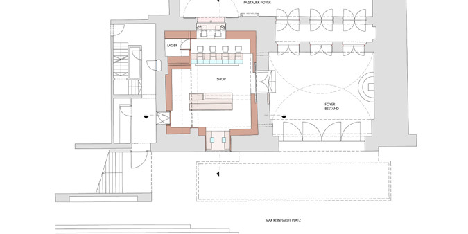 Der bestehende Festspielshop zwischen dem Haus für Mozart und dem Großen Festspielhaus in der Salzburger Altstadt konnte durch die Entfernung aller nicht tragenden Innenwände vergrößert werden. Eingefügte Podeste sowie eine bis ins Detail durchdachte Möblierung mit Wandver-täfelungen, Regalen, Vitrinen sowie einem frei-stehendem Möbel schaffen verschiedene Raum-zonen. Der Bereich der Abendkassa in Richtung Faistauer Foyer kann mittels einer großen Schiebetür vom übrigen Shop getrennt werden. Besonderer Blickfang von außen sind die beiden Sitzbänke in der Fensternische, für welche Touchscreens und Kopfhörer zum Musikhören vorgesehen sind.