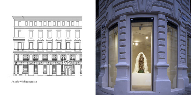 Die Räume eines ehemaligen, dreigeschoßigen Geschäftslokals mit 620 m² Nutzfläche im einstigen Stadtpalais der Grafen Abensperg-Traun im 1. Wiener Gemeindebezirk wurden zu einer Kunstgalerie umfunktioniert. Äußerste architek-tonische Zurückhaltung prägt die archaischen, stimmungsvollen Räume, welche für wechselnde Ausstellungen ideal sind. Unterschiedliche Gewölbeformen und Konchen des Altbestandes bilden dabei einen spannenden Dialog mit den ausgestellten Werken. Eine Reihe 'unsichtbarer' Details und das durchdachte Beleuchtungskonzept unterstreichen den hohen qualitativen Anspruch. Bewegliche, raumhohe Ausstellungswände bieten Flexibilität in der Ausstellungsgestaltung.