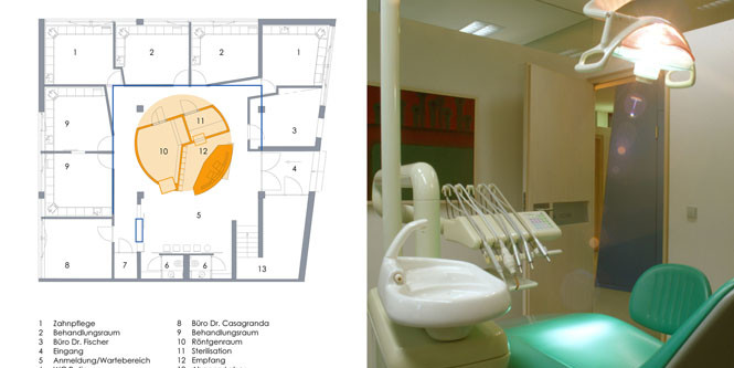 Ein Büro im Erdgeschoß eines Verwaltungs-gebäudes der siebziger Jahre wurde zu einer Zahnarztgemeinschaftspraxis umfunktioniert. Zu diesem Zweck wurden sämtliche bestehende Zwischenwände entfernt und Ordinations- bzw. Ärztebüros an die ausreichend belichteten Außenwände gelegt. Rezeption, Wartebereich sowie Funktionsräume fanden im Bereich der Mitte Platz. Dabei wurde ein blauer Kegelstumpf aus matt lackiertem Holz in Form eines Raumobjektes, welches Anmeldung, Röntgen sowie Sterilisation in sich aufnimmt, in den Raum "implantiert". Eingeschobene Holzboxen bieten Platz für Register und technische Geräte.[nbsp]
