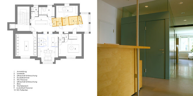 Die Röntgenpraxis befindet sich im ersten Obergeschoß eines Altbauhauses. In einem ersten Renovierungsschritt im Jahr 1993 wurde der Eingangsbereich neu strukturiert. Dabei setzt ein schräg eingefügter Kubus, welcher Umkleide-räume, eine Dunkelkammer für Röntgenaus-arbeitung und eine Toilette beiinhaltet, den besonderen räumlichen Akzent. Die Box besteht aus offenporig lackiertem Holz und setzt sich nach oben durch ein Lichtband aus Glas vom Plafond des Altbestandes ab. Eine Neukonzeption des Wartebereiches und der Untersuchungsräume folgte 2001, wobei satinierte Glasscheiben durch ihre Leichtigkeit eine helle und freundliche Atmosphäre schaffen.